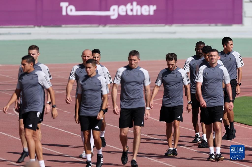 11月18日,國(guó)際足聯(lián)裁判委員會(huì)主席皮耶路易吉·科利納(后右)觀看訓(xùn)練。新華社記者 賈浩成 攝