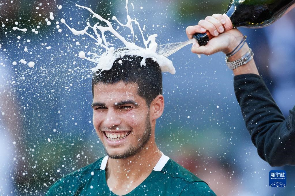 這是2022年5月8日,阿爾卡拉斯在馬德里網(wǎng)球公開(kāi)賽男子單打頒獎(jiǎng)儀式上慶祝。新華社記者 孟鼎博 攝