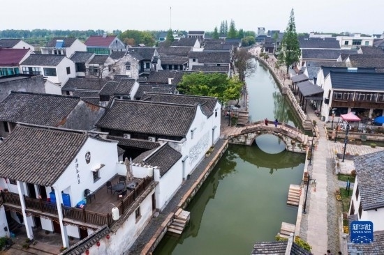 4月11日拍攝的織里鎮(zhèn)義皋村古村落景區(qū)(無(wú)人機(jī)照片)。
