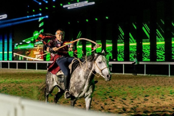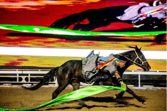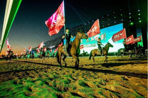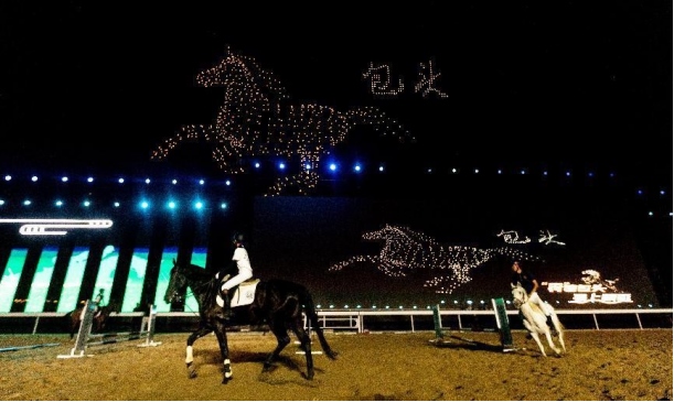 開幕式文體表演由《馬術(shù)方陣一馬當(dāng)先》、歌伴舞《我的城我的馬》、《名馬展示策馬揚(yáng)鞭》、《單馬技巧雙翼神馬》、《馬障礙秀躍馬揚(yáng)鞭》、《馬術(shù)秀人馬合一》、歌伴舞《騎跡包頭》、《無人機(jī)秀馬上精彩》八塊內(nèi)容組成。當(dāng)晚的賽汗塔拉馬術(shù)賽場流光溢彩、氣氛熱烈,場內(nèi)座無虛席、歡聲雷動。20時(shí)30分許,主騎手手持國旗,副騎手手持馬城旗幟,運(yùn)動員方陣、民族方陣、女騎方陣、馬主方陣入場,騎手們精神飽滿、英姿颯爽,不時(shí)揮手致意,現(xiàn)場觀眾用熱烈的掌聲和歡呼聲,歡迎他們的到來。達(dá)茂旗9歲賽馬冠軍阿茹樂手持彩旗引出世界名馬亮相,40對人馬合一的“千古馬頌”表演震撼全場,1000架無人機(jī)躍然天空,點(diǎn)亮“騎跡包頭 馬上精彩”的字樣……藍(lán)天、碧水、凈土的包頭在策馬奔騰的馬術(shù)競技中拉開了“中國馬城”的壯麗畫卷。