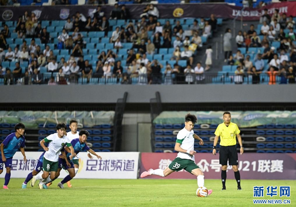 ??6月15日,浙江俱樂部U21隊(duì)球員王鈺棟(前右)在比賽中主罰點(diǎn)球得分。