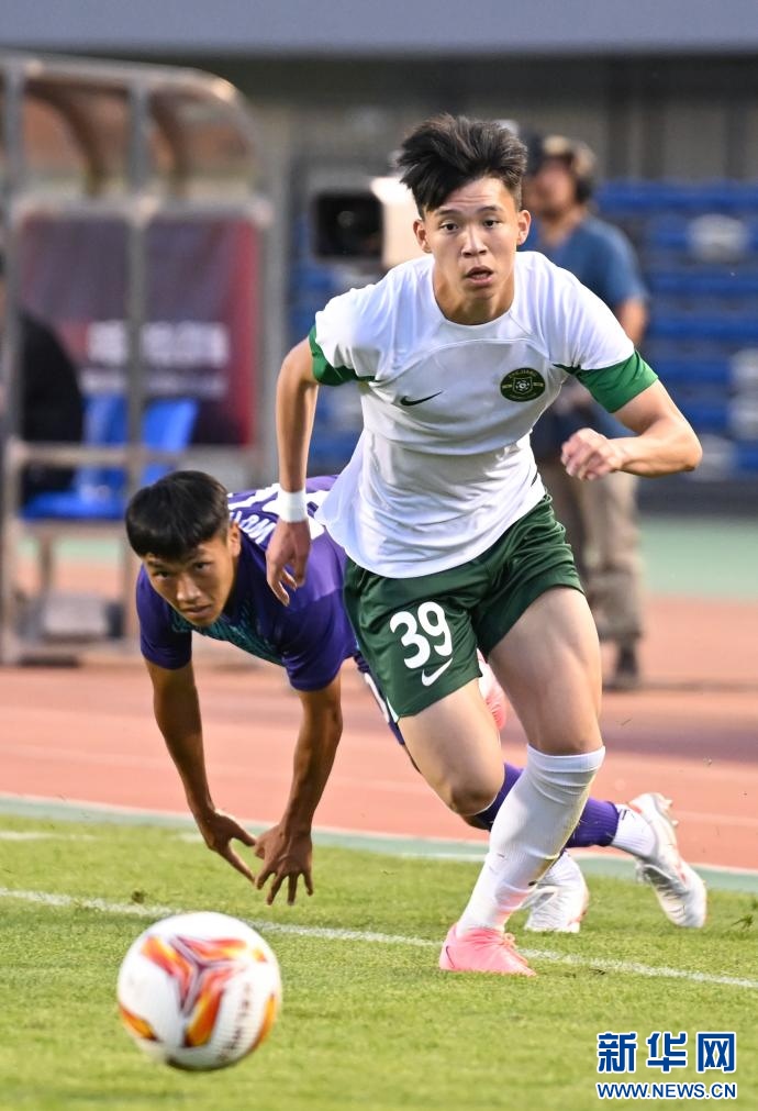 ??6月15日,浙江俱樂部U21隊(duì)球員王鈺棟(前)在比賽中帶球突破。