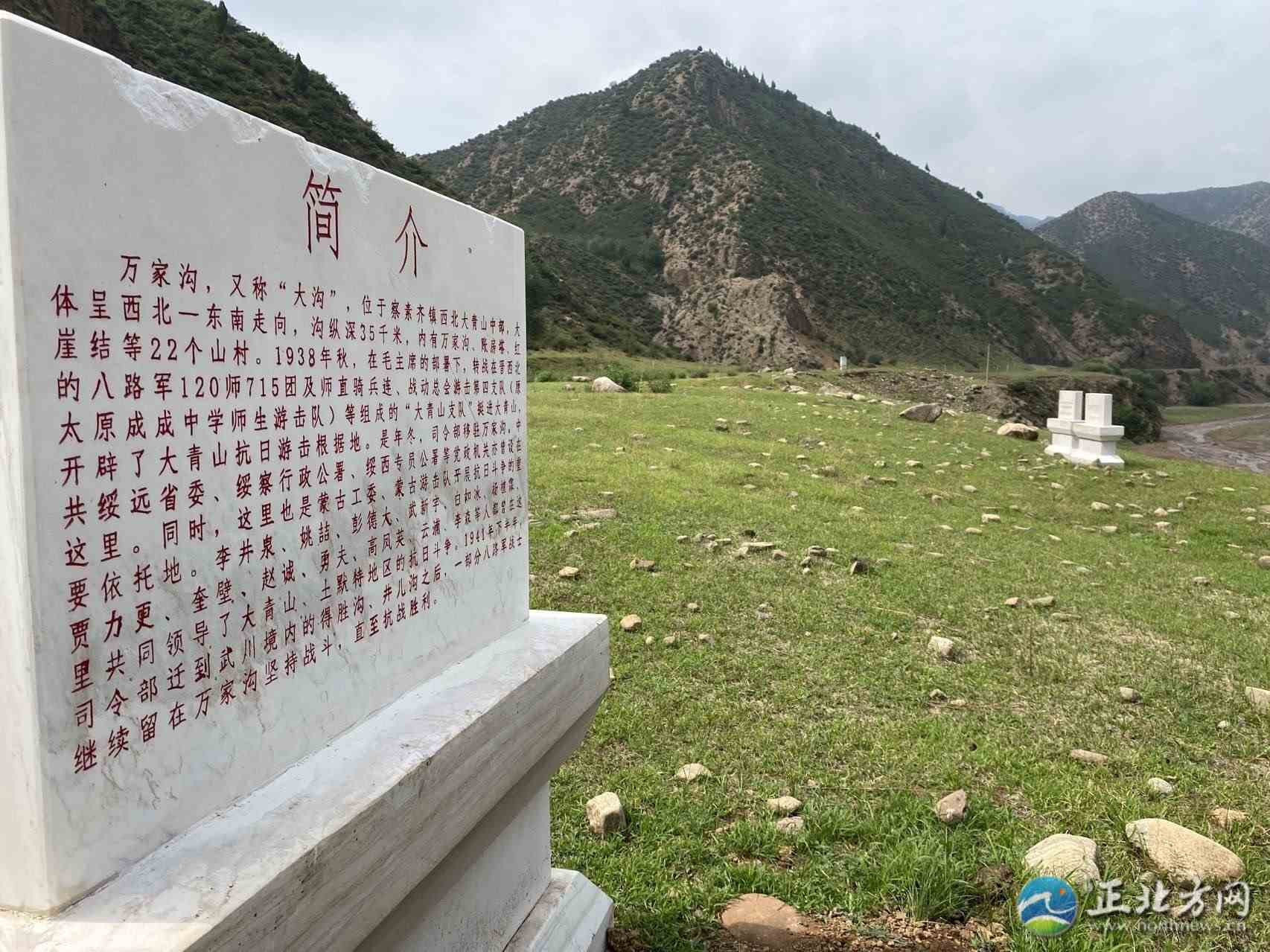 入溝不久,在綠草如茵的山坡上,就可以眺望到遠(yuǎn)處已經(jīng)廢棄的民房,有幾十年前的老房子,也有建筑時(shí)間不長的,眼前的一切讓人恍惚,仿佛剛剛還在上演煙火氣息的鄉(xiāng)村生活。在這里矗立著寫有“萬家溝革命遺址”的漢白玉紀(jì)念碑,這是土左旗文物保護(hù)中心副主任高鷹和同事們半年前安放的。從這里,萬家溝革命遺址的探訪正式開始。