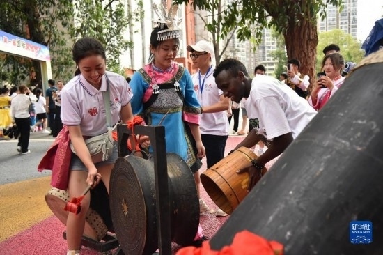 6月5日,參加三都高級中學第一屆國際文化節(jié)的來華留學生體驗敲擊銅鼓。