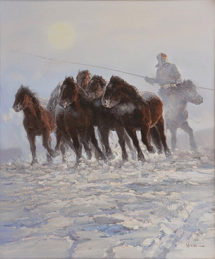 哈日巴拉油畫《逐夢前行蒙古馬》