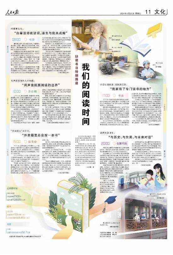 閱讀是什么?是一頁(yè)一卷,傳承千年文脈;是出行忙碌,隨身攜帶的星辰大海;是廣袤山鄉(xiāng),指引孩子們成長(zhǎng)的燈塔;也是靜謐時(shí)光,陪伴無(wú)數(shù)個(gè)日夜的詩(shī)和遠(yuǎn)方……第二十九個(gè)世界讀書日,我們關(guān)注多種多樣的閱讀時(shí)間,這些鮮活的場(chǎng)景展現(xiàn)著當(dāng)下人們閱讀生活的方方面面。讓我們從不同行業(yè)、不同年齡的讀者視角,感受文明的印記,見證時(shí)代進(jìn)步的力量。