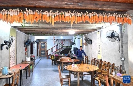 居民在運江古鎮(zhèn)自家的民宿里整理桌椅(10月11日攝)。