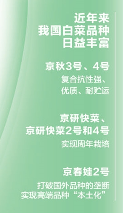 近年來,我國白菜育種實(shí)力突飛猛進(jìn),品種日益豐富,實(shí)現(xiàn)了從單一“秋播冬貯”向優(yōu)勢產(chǎn)區(qū)生產(chǎn)、產(chǎn)品多樣化和周年生產(chǎn)轉(zhuǎn)變。培育出了復(fù)合抗性強(qiáng)、優(yōu)質(zhì)、耐貯運(yùn)的品種“京秋3號、4號”等,高品質(zhì)、速生苗用品種“京研快菜、京研快菜2號和4號”3個品種搭配實(shí)現(xiàn)了周年栽培,解決了生產(chǎn)上長期缺乏冬春和夏季栽培專用品種的難題。還育成了娃娃菜、快菜、紹菜、金絲白等高品質(zhì)品種,尤其是“京春娃2號”一舉打破國外品種的壟斷,它比國外品種早熟5至7天,種植密度高25%,畝收入增長30%,已成為國產(chǎn)娃娃菜第一大品種,實(shí)現(xiàn)了高端品種的“本土化”。