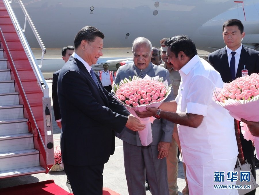 10月11日,國(guó)家主席習(xí)近平乘專(zhuān)機(jī)抵達(dá)金奈,應(yīng)印度共和國(guó)總理莫迪邀請(qǐng),出席中印領(lǐng)導(dǎo)人第二次非正式會(huì)晤。印度泰米爾納德邦邦長(zhǎng)普羅希特、首席部長(zhǎng)帕拉尼斯瓦米等在舷梯旁迎接,向習(xí)近平敬獻(xiàn)鮮花。