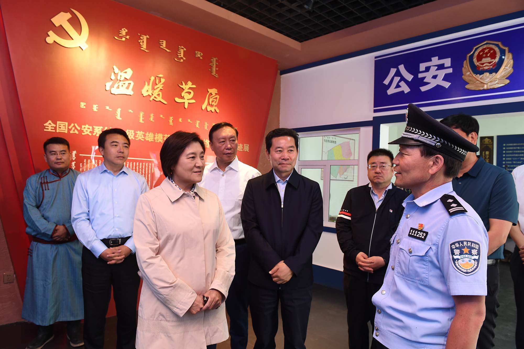 6月9日,自治區(qū)黨委副書記、自治區(qū)主席布小林來到巴彥淖爾市烏拉特后旗公安局潮格溫都爾鎮(zhèn)寶音德力格爾事跡館參觀,與寶音德力格爾親切交談。內蒙古日報社融媒體記者 韓卿立攝