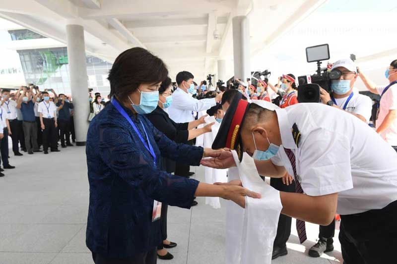自治區(qū)黨委副書記、自治區(qū)主席布小林宣布赤喀高鐵正式開通運營,并與自治區(qū)副主席艾麗華、自治區(qū)政府秘書長包振玉以及中國鐵路沈陽局集團有限公司、蒙遼鐵路客運專線有限責任公司、赤峰市委負責同志一起為列車組人員敬獻哈達。
