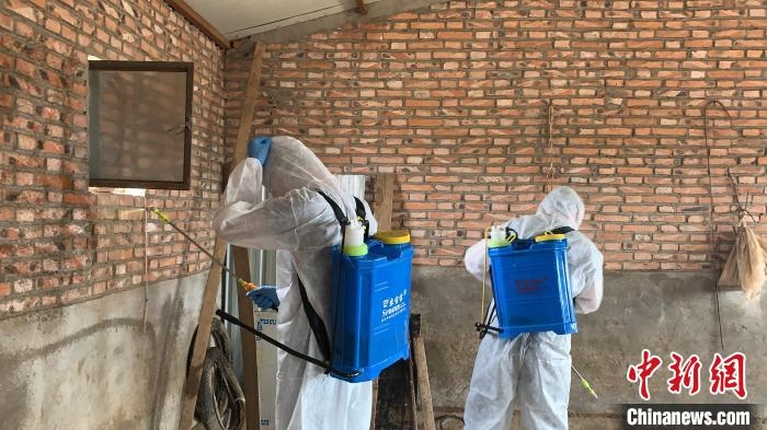 圖為呼斯楞正在跟同事一起為賽因烏力吉家棚圈消毒。 奧藍(lán) 攝