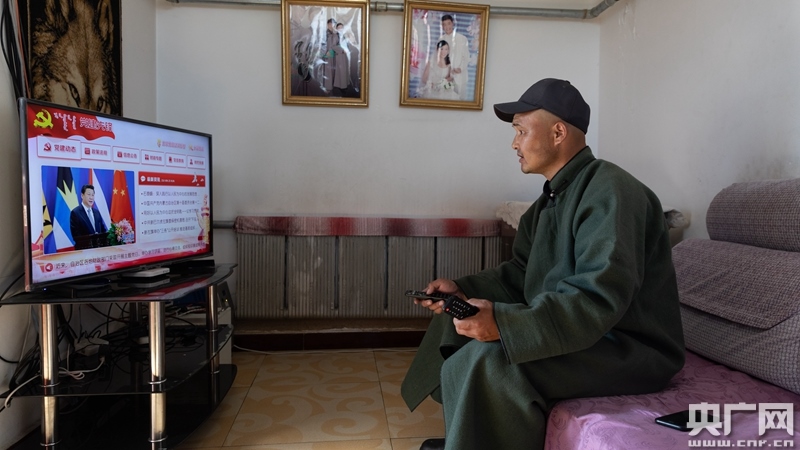 蘇尼爾通過電視平臺(tái)收看黨建平臺(tái)(中央廣播電視總臺(tái)央廣記者 王藝 攝)