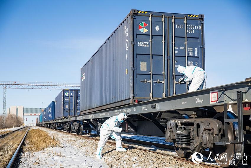二連出入境邊防檢查站執(zhí)勤民警對(duì)中歐班列進(jìn)行車體檢查。郭鵬杰 攝