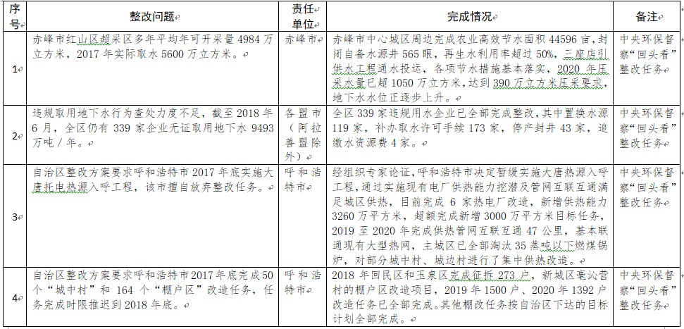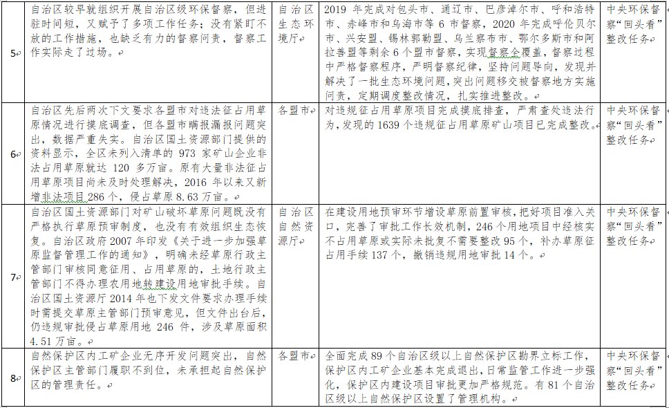 中央環(huán)境保護督察以來,自治區(qū)各級黨委政府及相關部門高度重視反饋意見整改工作,貫徹落實習近平生態(tài)文明思想的自覺性和主動性顯著增強,采取強有力措施積極推動整改工作,整改工作取得階段性成果。近期部分整改任務已通過自治區(qū)相關委辦廳局驗收,現予以公示,公示期2021年2月5日至2月9日,未提出異議的整改任務給予銷號(聯系電話:0471-4632171)。