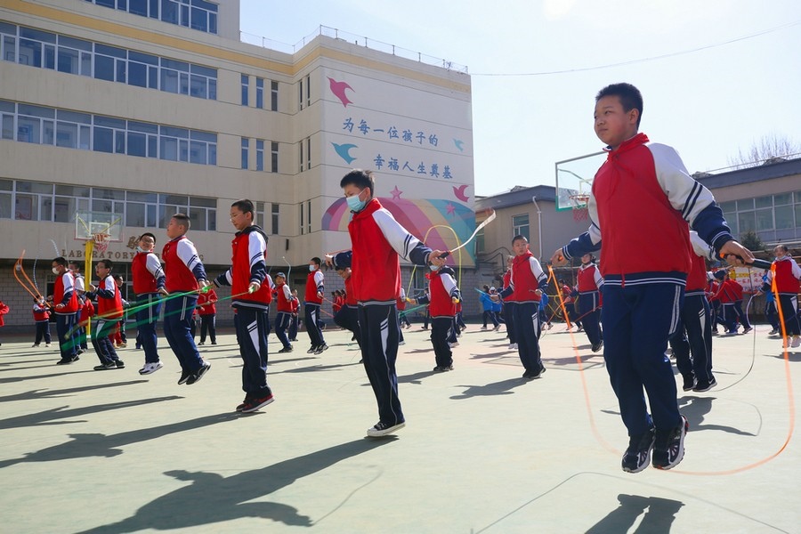 同學(xué)們?cè)诓賵?chǎng)練習(xí)跳繩  彭瑞誠 攝影