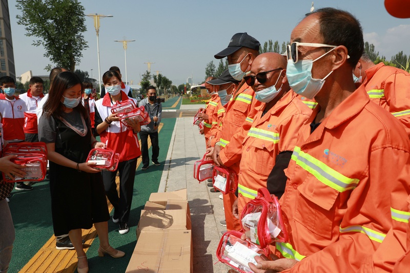 活動中,三家黨組織和志愿者們向呼和浩特僑銀城市管理有限公司、呼和浩特市回民區(qū)環(huán)境衛(wèi)生服務(wù)中心的環(huán)衛(wèi)工人共捐贈夏日清涼包200套。