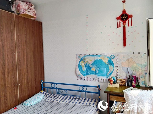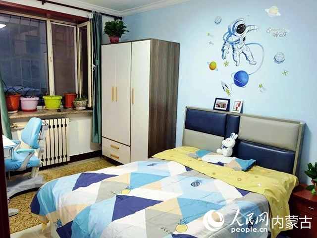 在對原有住房進(jìn)行規(guī)劃、設(shè)計后,施工隊開始裝修,并配備必要的家具、臥具和學(xué)習(xí)生活用品。歷時半個多月,一間以藍(lán)色為主色調(diào)的小屋建成了?,F(xiàn)在,屬于浩博的那一半臥室,泛黃的臥室墻壁被粉刷成淡藍(lán)色,換了新的小床和衣柜,新添置的書桌上擺滿了課外書,看起來整潔又溫馨。