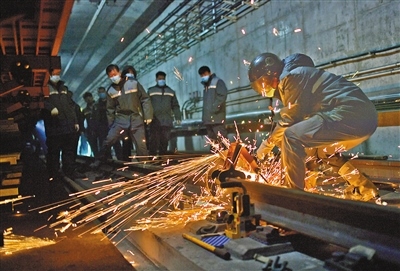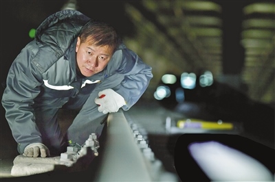 昏暗、逼仄的軌行區(qū)內,軌道檢修師們焊接鋼軌時迸發(fā)的火花顯得格外耀眼,維修軌道設備時敲擊鋼軌的聲音顯得格外清脆、響亮。據(jù)田智宏介紹,一個軌道檢修師每次夜間軌行區(qū)的巡檢作業(yè)大約要走7公里路程。他和工友們每天要檢查數(shù)千個部件,測量上百個數(shù)據(jù),其中一項重要巡檢工作就是檢查扣件和接頭聯(lián)結零件的組成部件是否安裝牢固,螺栓是否松動。他指了指自己腳上的鞋說:“我們的檢修對象不僅笨重且危險性較高,為了防止腳部受到傷害,鞋子都是特制的防砸絕緣鞋?!?/p>