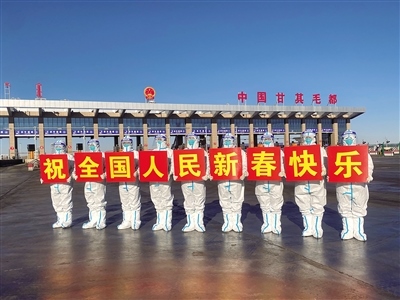 1月31日,民警在甘其毛都口岸貨運(yùn)通道祝全國(guó)人民新春快樂(lè)。春節(jié)期間,內(nèi)蒙古甘其毛都出入境邊防檢查站民警堅(jiān)守一線,為出入境車輛提供優(yōu)質(zhì)高效的通關(guān)服務(wù),守護(hù)萬(wàn)家燈火。(記者 孟和朝魯 通訊員 宋緒明 攝)