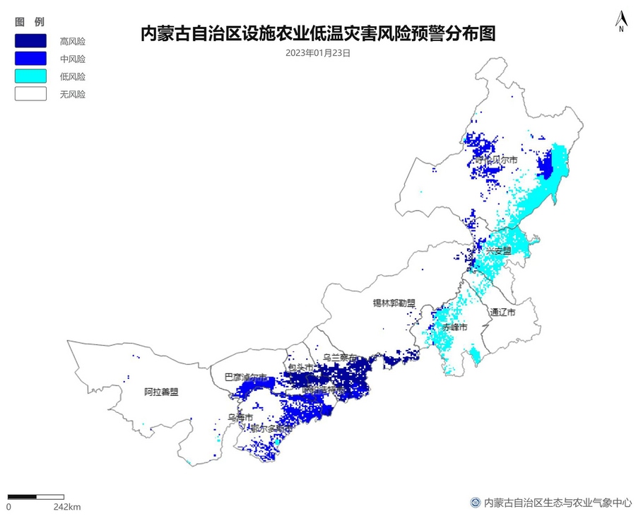根據(jù)智能網(wǎng)格預(yù)報(bào)數(shù)據(jù),結(jié)合設(shè)施農(nóng)業(yè)低溫災(zāi)害和風(fēng)災(zāi)指標(biāo),1月21日至23日,呼倫貝爾市東南部、東南部偏西地區(qū)為設(shè)施農(nóng)業(yè)低溫災(zāi)害低風(fēng)險(xiǎn)地區(qū),東北部中部及東部、中部偏南大部、西部偏東部分地區(qū)為設(shè)施農(nóng)業(yè)低溫災(zāi)害中或高風(fēng)險(xiǎn)地區(qū),低溫災(zāi)害將導(dǎo)致作物生長(zhǎng)緩慢和受凍;21至23日,東南部部分地區(qū)、中部偏西南局部地區(qū)及鄂爾多斯市零星地區(qū)為設(shè)施農(nóng)業(yè)風(fēng)災(zāi)低風(fēng)險(xiǎn)地區(qū),其中,22日鄂爾多斯市北部零星地區(qū)、23日錫林郭勒盟東部零星地區(qū)、烏蘭察布市中部局部地區(qū)為設(shè)施農(nóng)業(yè)風(fēng)災(zāi)中或高風(fēng)險(xiǎn)地區(qū),風(fēng)災(zāi)易造成溫室結(jié)構(gòu)受損。
