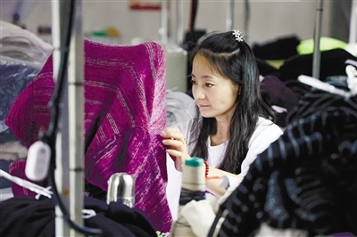 章嘉廟村一羊絨制品廠的工人正在趕制訂單。本報(bào)記者馬駿馳攝