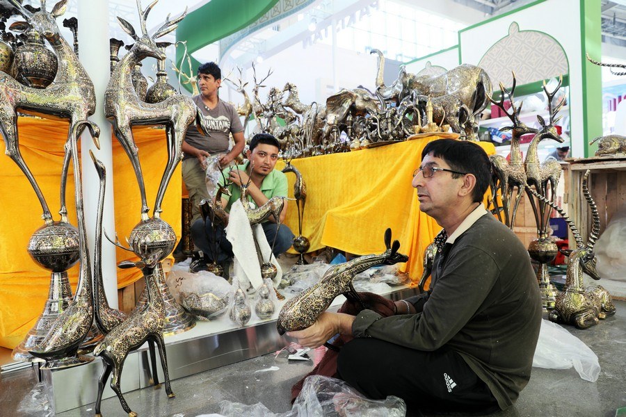 參展機(jī)構(gòu)工作人員正在布置展品