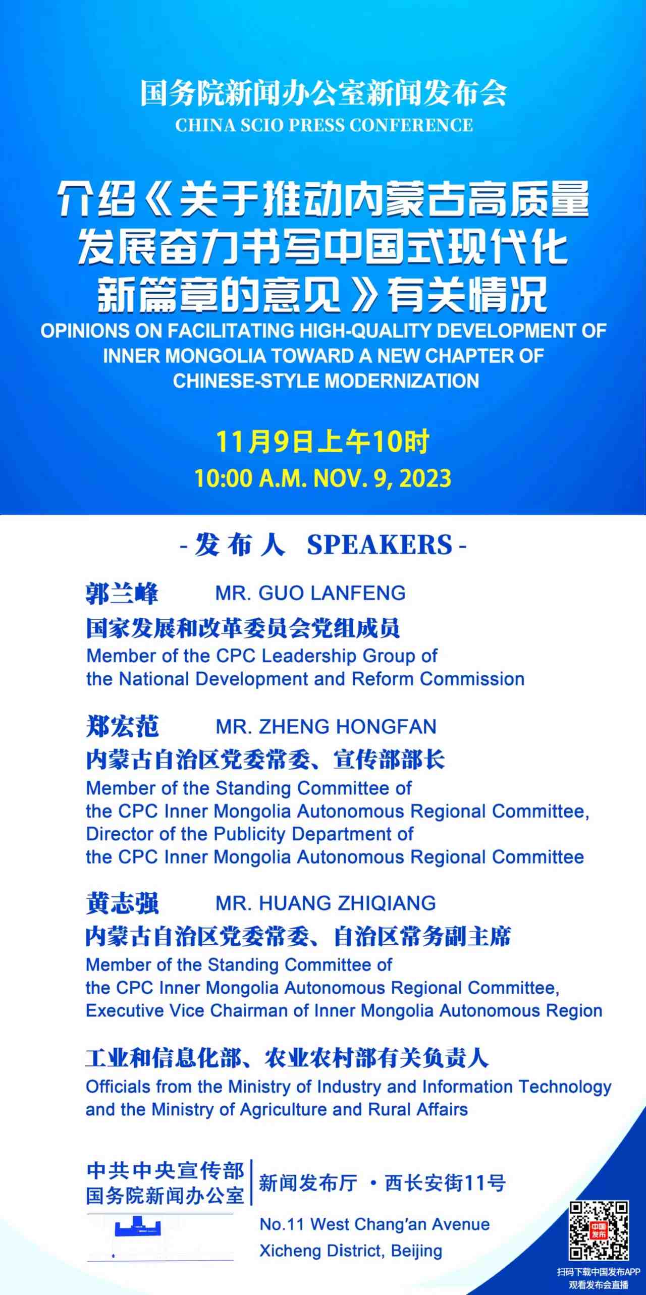 2023年11月9日(星期四)上午10時(shí),國(guó)務(wù)院新聞辦公室舉行新聞發(fā)布會(huì),請(qǐng)國(guó)家發(fā)展和改革委員會(huì)黨組成員郭蘭峰,內(nèi)蒙古自治區(qū)黨委常委、宣傳部部長(zhǎng)鄭宏范,內(nèi)蒙古自治區(qū)黨委常委、自治區(qū)常務(wù)副主席黃志強(qiáng)和工業(yè)和信息化部、農(nóng)業(yè)農(nóng)村部有關(guān)負(fù)責(zé)人介紹《關(guān)于推動(dòng)內(nèi)蒙古高質(zhì)量發(fā)展奮力書寫中國(guó)式現(xiàn)代化新篇章的意見》有關(guān)情況,并答記者問。