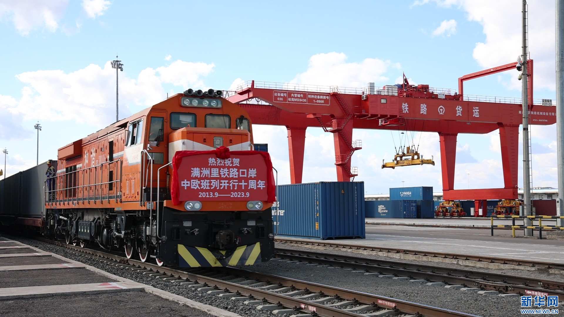 蘇-滿(mǎn)-歐集裝箱班列在滿(mǎn)洲里換裝。新華網(wǎng)發(fā) (李新軍 攝)