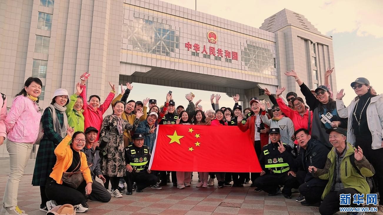 游客在滿(mǎn)洲里國(guó)門(mén)下合影。新華網(wǎng)發(fā) (李新軍 攝)