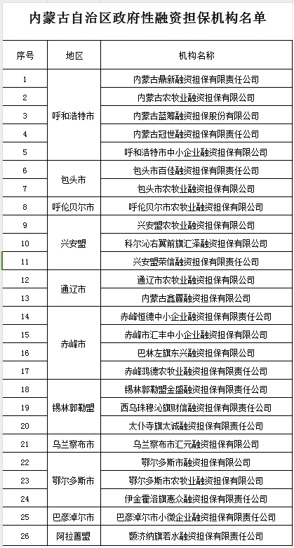 內(nèi)蒙古公布26家政府性融資擔(dān)保機構(gòu)