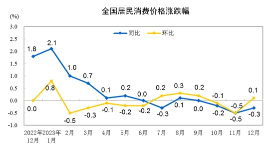 2023年12月份,全國居民消費價格同比下降0.3%。其中,城市下降0.3%,農(nóng)村下降0.5%;食品價格下降3.7%,非食品價格上漲0.5%;消費品價格下降1.1%,服務(wù)價格上漲1.0%。