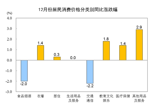 12月份,全國居民消費價格環(huán)比上漲0.1%。其中,城市上漲0.1%,農(nóng)村上漲0.1%;食品價格上漲0.9%,非食品價格下降0.1%;消費品價格上漲0.1%,服務(wù)價格上漲0.1%。