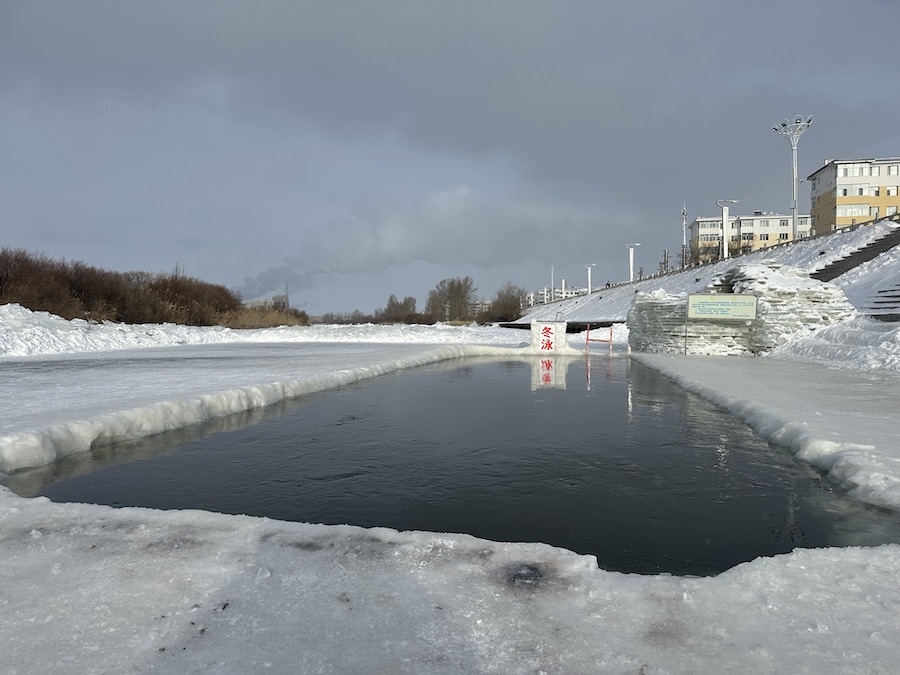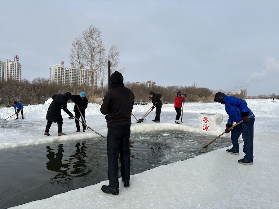 參加冬泳的協(xié)會成員只著泳衣,依次跳入在伊敏河冰面開鑿的冬泳池中,雖然天寒地凍,但是依然精神抖擻。