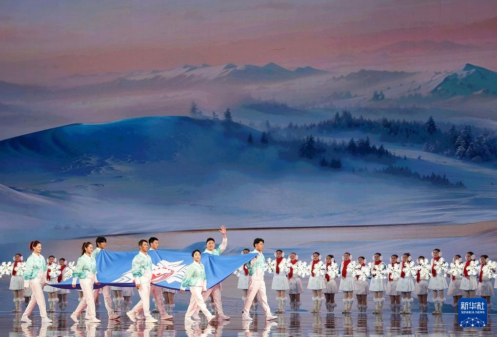 ??2月17日,中華人民共和國第十四屆冬季運(yùn)動會會旗入場。新華社記者 連振 攝