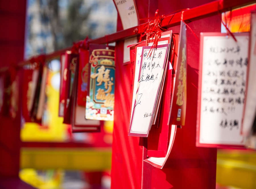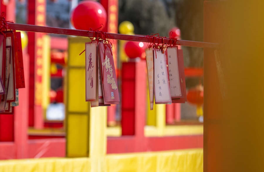在九曲中,有九道門,其中八道門可以猜燈謎,猜對(duì)后換一張祈福卡來到吉祥門進(jìn)行許愿祈福。