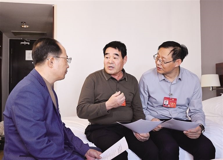 3月4日,住我區(qū)全國政協(xié)委員阿拉騰達來(左)、廷·巴特爾(中)、曹金山(右)在住地,就進一步提高草原生態(tài)保護補助獎勵標準,為打贏“三北”工程攻堅戰(zhàn)和三大標志性戰(zhàn)役奠定政策基礎的提案進行討論。草原全媒·內(nèi)蒙古新聞網(wǎng)記者 韓卿立 攝