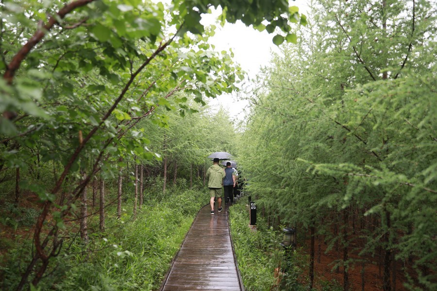 7月30日,細(xì)雨中的馬鞍山林場(chǎng)空氣清新,一隊(duì)游客正冒雨穿梭于林中參觀游覽。