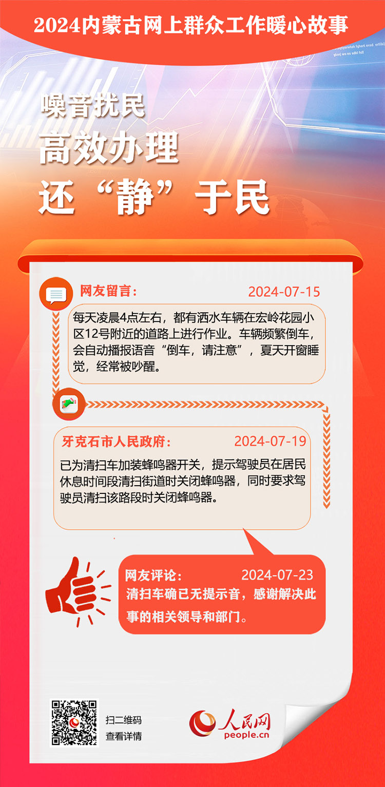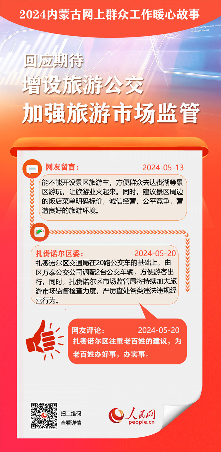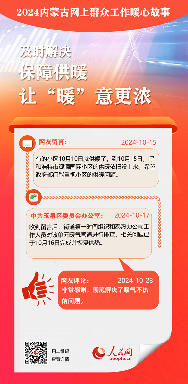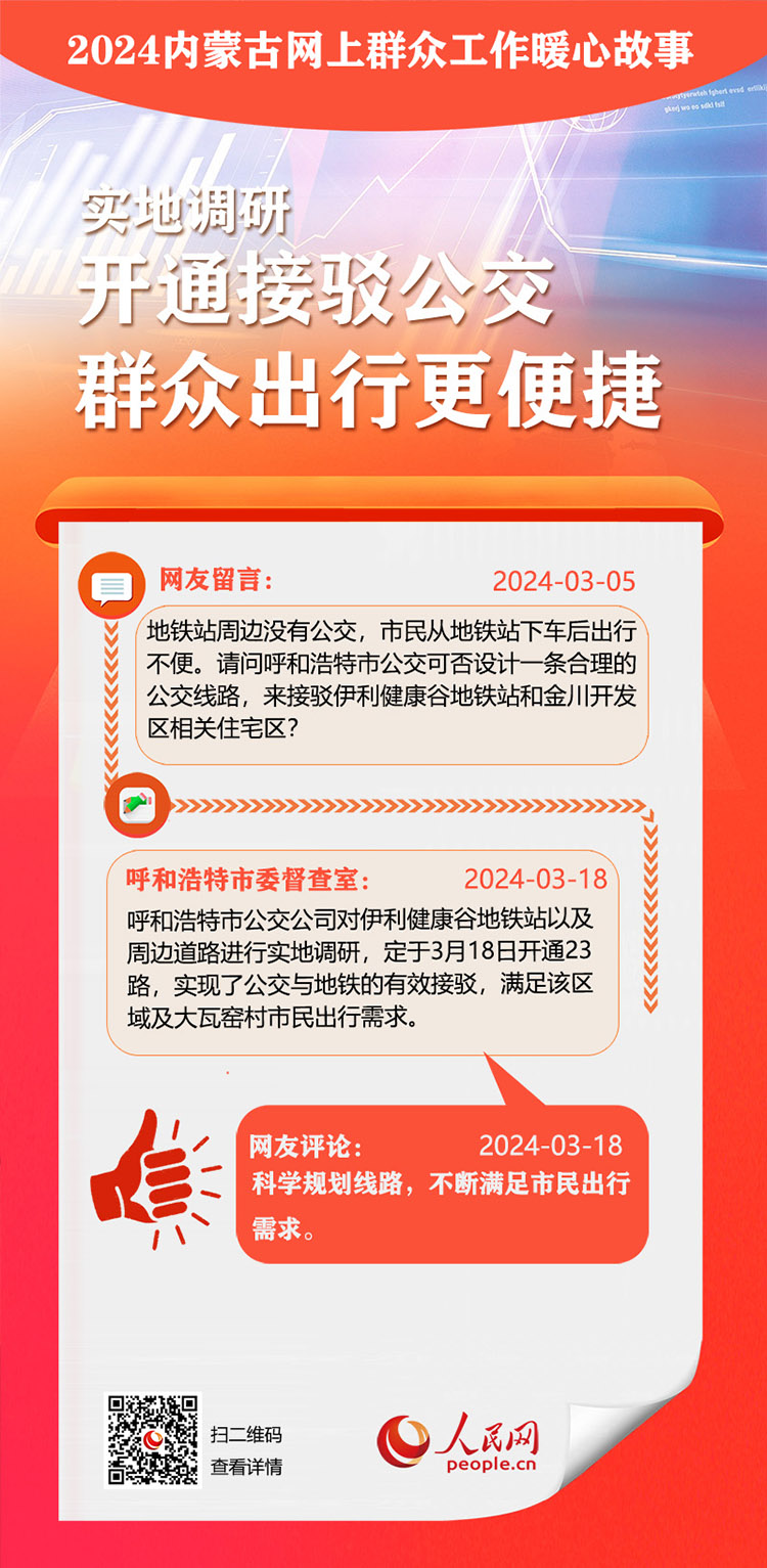 走好走實網(wǎng)上群眾路線 用心用情為民服務(wù)辦實事。依托人民網(wǎng)“領(lǐng)導(dǎo)留言板”,內(nèi)蒙古自治區(qū)各級黨委、政府著力解決網(wǎng)民反映的熱點難點。2024年,一批群眾關(guān)切的急難愁盼問題得到及時解決。人民網(wǎng)內(nèi)蒙古頻道推出特別策劃,盤點過去一年內(nèi)蒙古網(wǎng)上群眾工作那些暖心事。