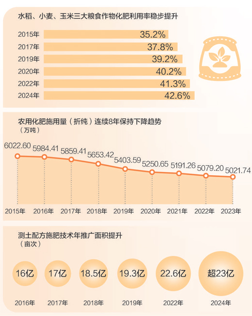 2024年,我國水稻、小麥、玉米三大糧食作物化肥利用率為42.6%,比2022年提高1.3個百分點(diǎn)?;世寐?,即化肥被作物吸收利用的比例,反映了化肥在農(nóng)業(yè)生產(chǎn)中的有效利用程度??茖W(xué)施肥效果提升,折射農(nóng)業(yè)發(fā)展方式之變。