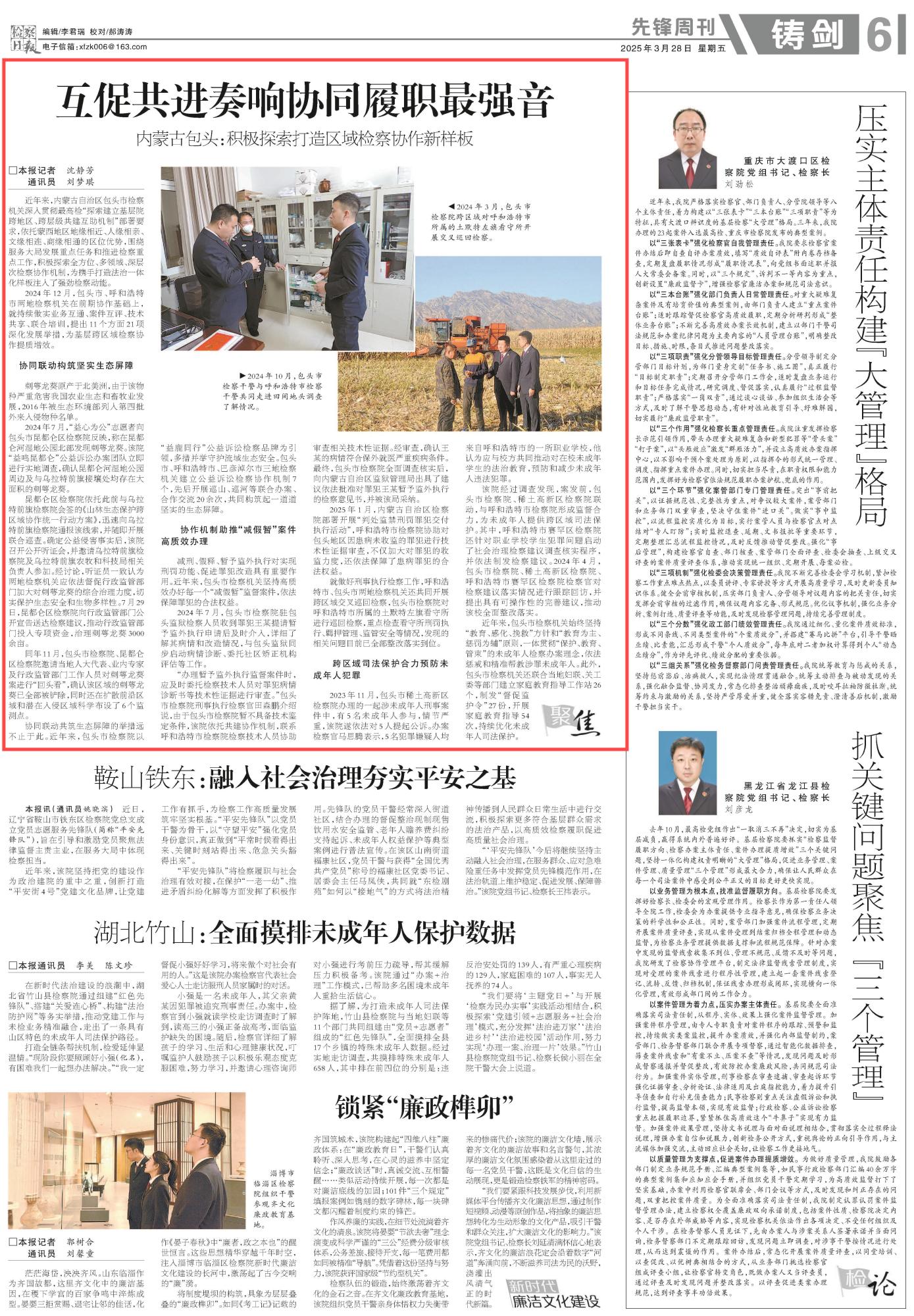 2025年3月28日,《檢察日報》第6版刊發(fā)題為《互促共進奏響協(xié)同履職最強音 內(nèi)蒙古包頭:積極探索打造區(qū)域檢察協(xié)作新樣板》的文章,報道了內(nèi)蒙古自治區(qū)包頭市檢察機關(guān)深入貫徹最高檢“探索建立基層院跨地區(qū)、跨層級共建互助機制”部署要求,積極探索全方位、多領(lǐng)域、深層次檢察協(xié)作機制,為攜手打造法治一體化樣板注入了強勁檢察動能。