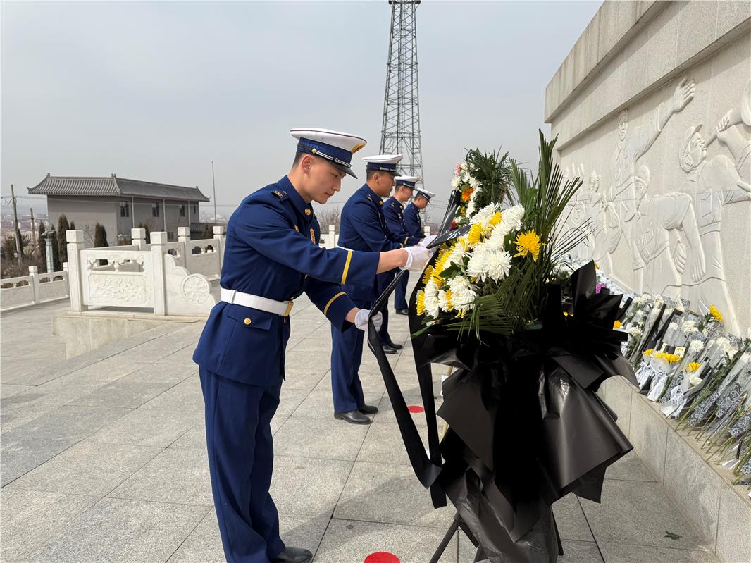 烏蘭察布市豐鎮(zhèn)市消防救援大隊工作人員向烈士紀念碑敬獻花籃。