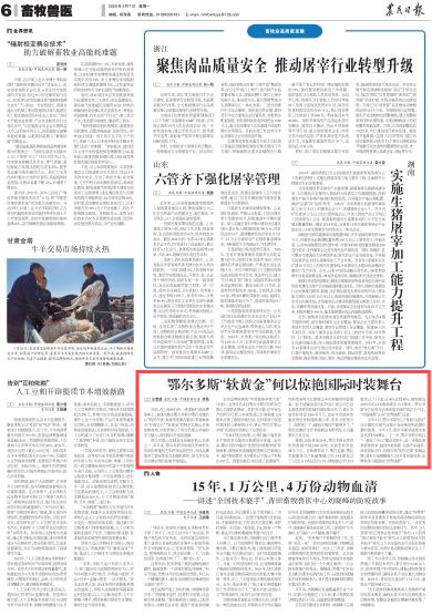 2025年4月7日,《農(nóng)民日報》第6版刊發(fā)題為《鄂爾多斯“軟黃金”何以驚艷國際時裝舞臺》的文章,報道了日前,在上海舉行的一場國際時裝品牌慶典上,來自內(nèi)蒙古鄂爾多斯市阿爾巴斯山羊絨驚艷亮相,受到國內(nèi)外客商追捧。該羊絨憑借卓越品質(zhì)斬獲慶典"年度最佳羊絨大獎",成為全球唯一獲此殊榮的產(chǎn)品。