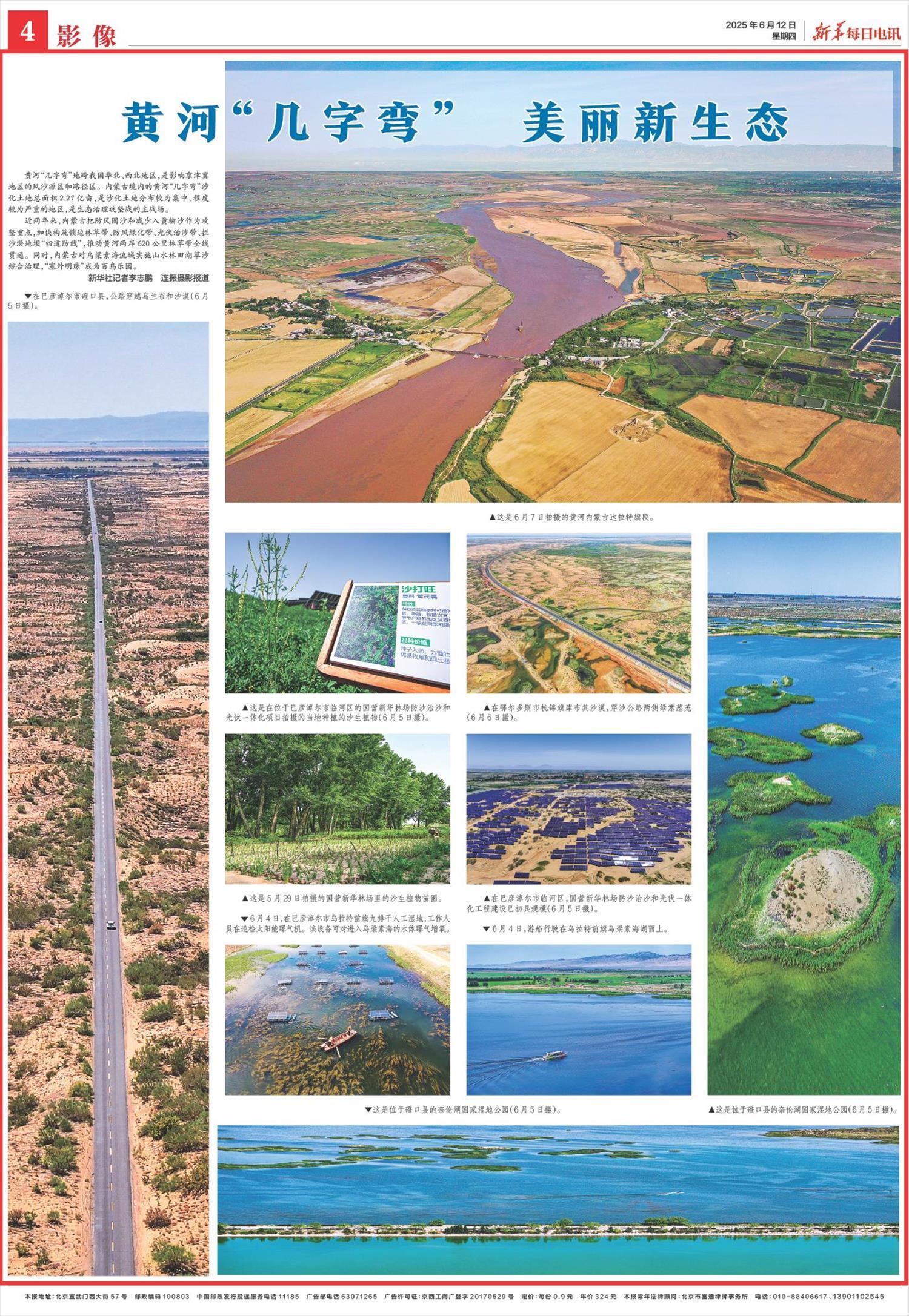 2025年6月12日,《新華每日電訊》第4版刊發(fā)題為《黃河“幾字彎” 美麗新生態(tài)》一文,報道了黃河“幾字彎”地跨我國華北、西北地區(qū),是影響京津冀地區(qū)的風(fēng)沙源區(qū)和路徑區(qū)。內(nèi)蒙古加快構(gòu)筑鎖邊林草帶、防風(fēng)綠化帶、光伏治沙帶、攔沙淤地壩“四道防線”,推動黃河兩岸620公里林草帶全線貫通。