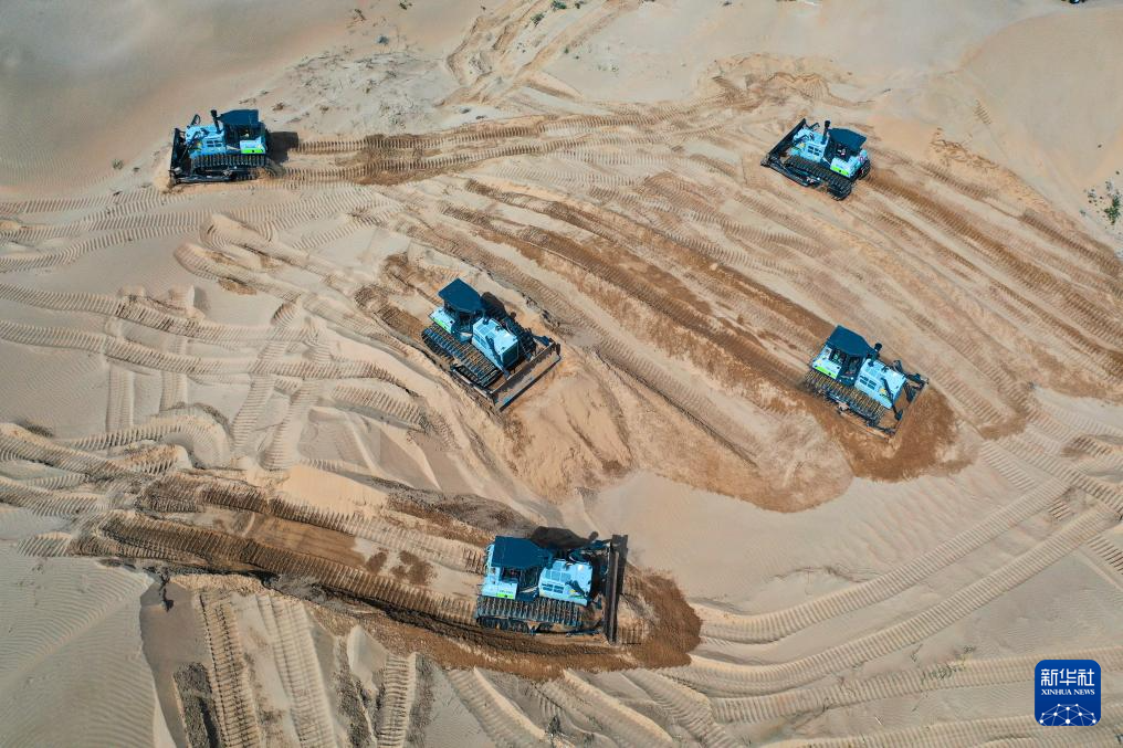 6月7日,在鄂爾多斯市達(dá)拉特旗境內(nèi)的庫布其沙漠,工程機(jī)械在平整沙地、開展光伏治沙工程建設(shè)(無人機(jī)照片)新華社記者 李志鵬 攝