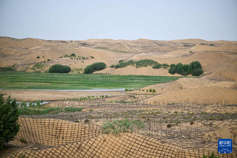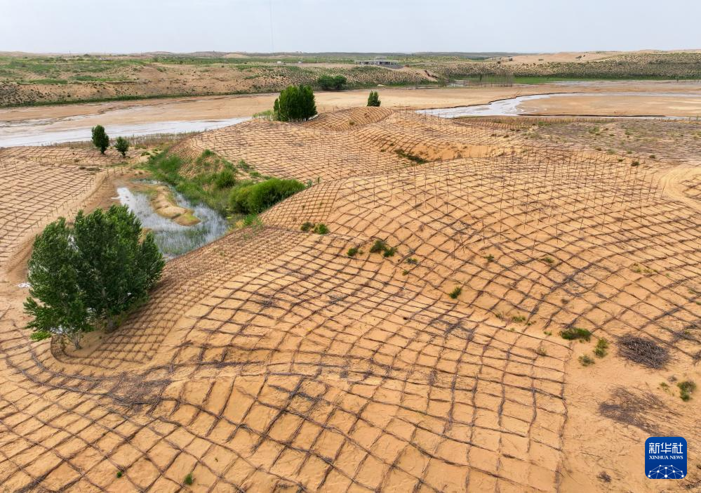 這是6月6日拍攝的鄂爾多斯市杭錦旗境內(nèi)庫布其沙漠中的一處綠洲(無人機(jī)照片)新華社記者 李志鵬 攝