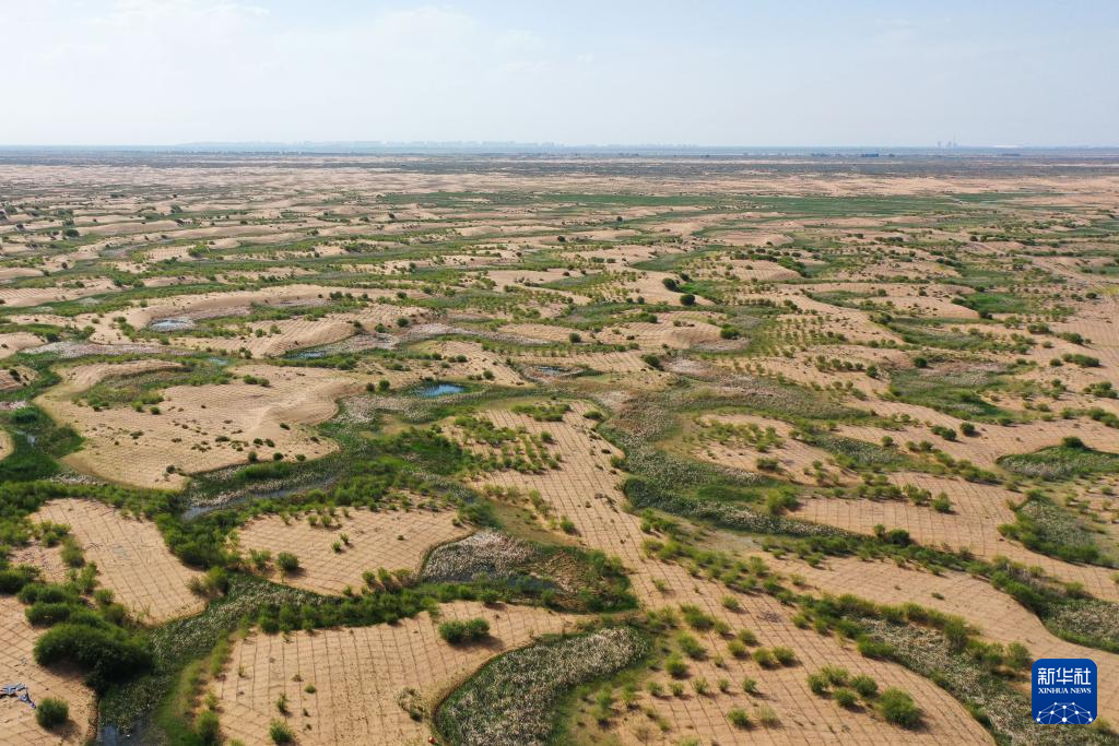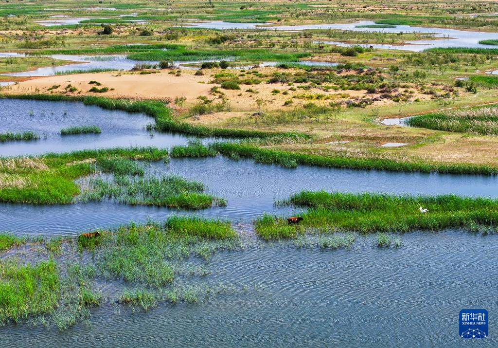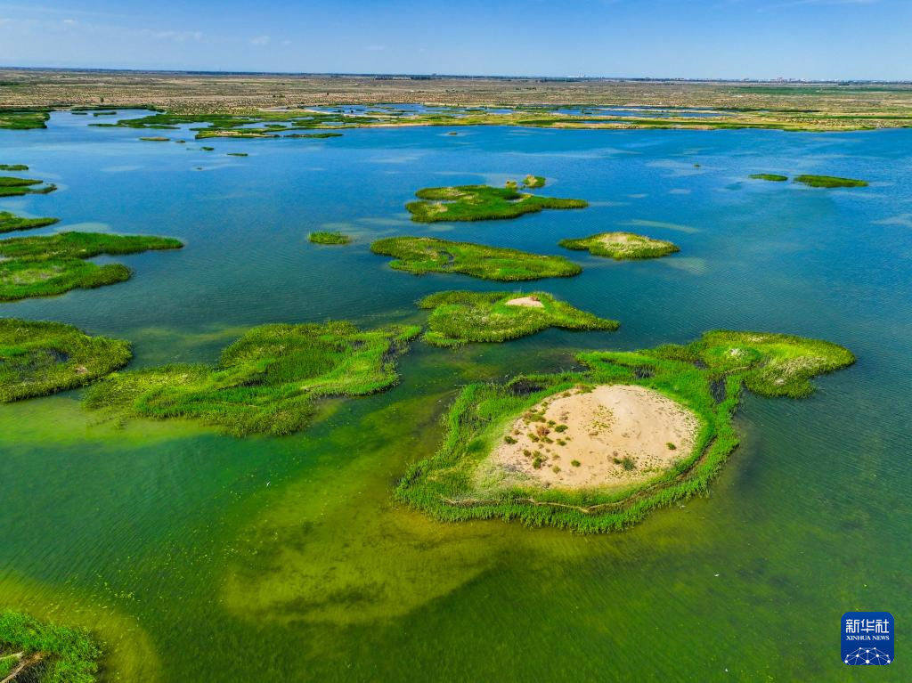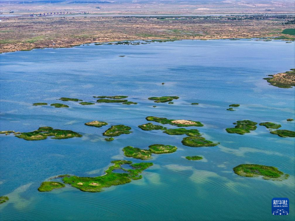 這是位于巴彥淖爾市磴口縣的奈倫湖國家濕地公園(6月5日攝,無人機(jī)照片)新華社記者 連振 攝