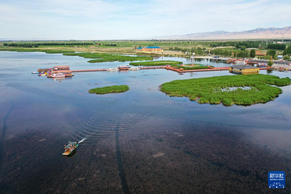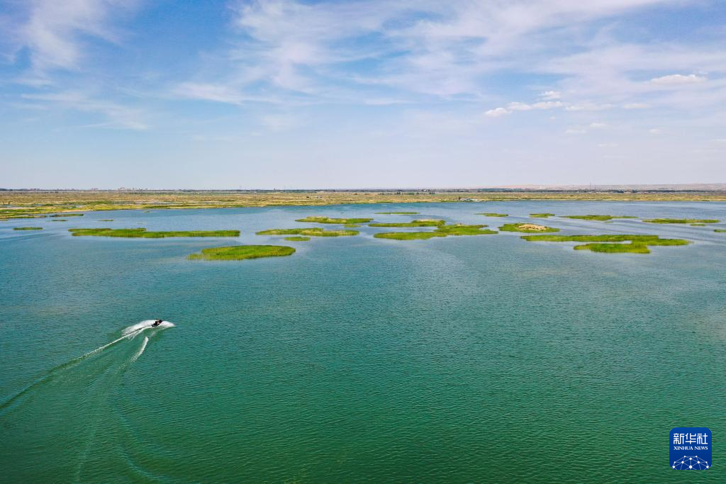 6月5日,在巴彥淖爾市磴口縣奈倫湖國家濕地公園,摩托艇行駛在湖面上(無人機(jī)照片)新華社記者 李志鵬 攝