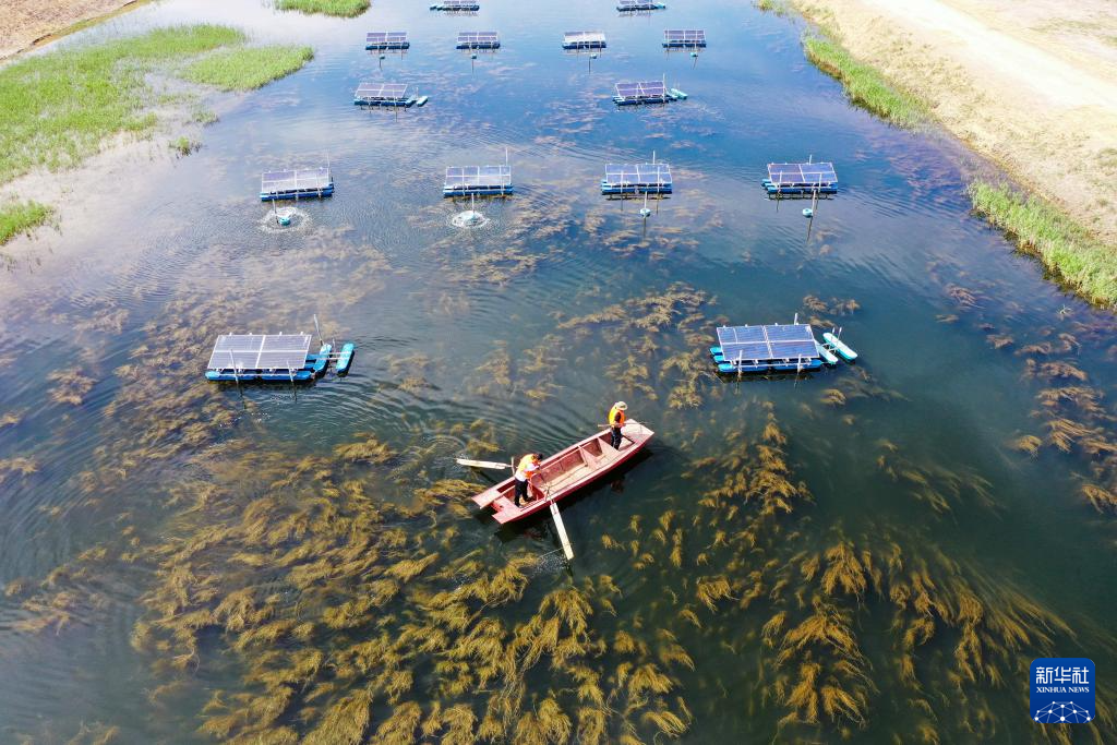 6月4日,在烏拉特前旗九排干人工濕地,工作人員在巡檢太陽能曝氣機(jī)。該設(shè)備可對進(jìn)入烏梁素海的水體曝氣增氧(無人機(jī)照片)新華社記者 李志鵬 攝