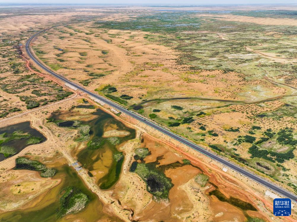在鄂爾多斯市杭錦旗庫布其沙漠,穿沙公路兩側(cè)綠意蔥蘢(6月6日攝,無人機(jī)照片)新華社記者 連振 攝